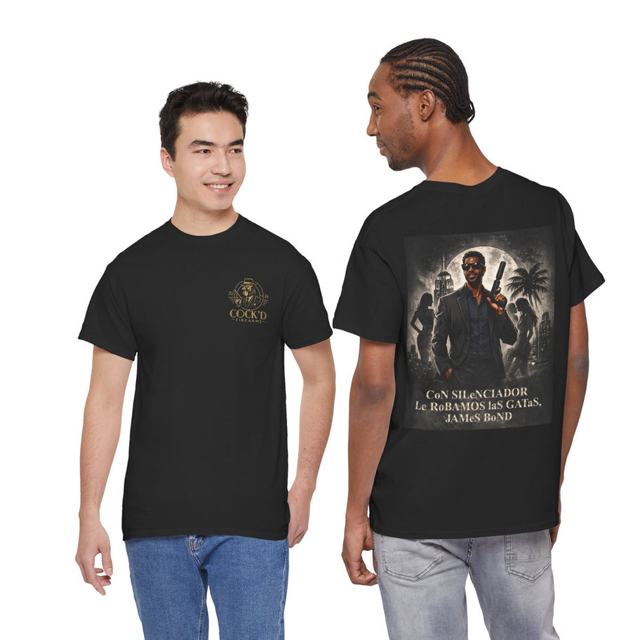 Culture doesn’t always shout. Sometimes it leans back, lights a cigarette, and lets the room notice. The Con Silenciador Tee carries that late-night pulse — moody, cinematic, and quietly daring. A deep black canvas holds a refined, edgy illustration that reads like a scene from a midnight film: confident silhouettes, shadowed streets, and a hush of attitude. Wear it to shows, after-parties, or city nights when you want your look to speak with intent rather than explanation. The fit settles comfortably on the body, the collar keeps its shape, and the print techniques keep every line crisp — a shirt built to move through scenes and leave an impression without saying a word.